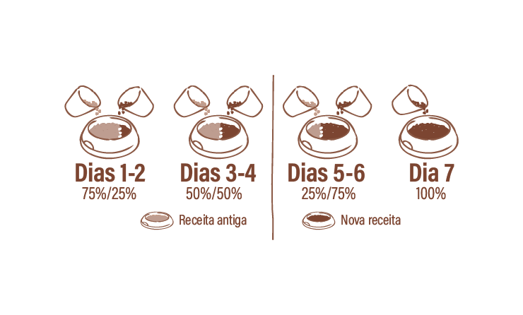 Para mudar a alimentação do seu cão ou gato, recomendamos a transição gradual entre os produtos anteriores e os novos. O processo é simples, realiza-se em 7 dias e ajuda o seu cão ou gato a adaptar-se sem dificuldades ao novo alimento.